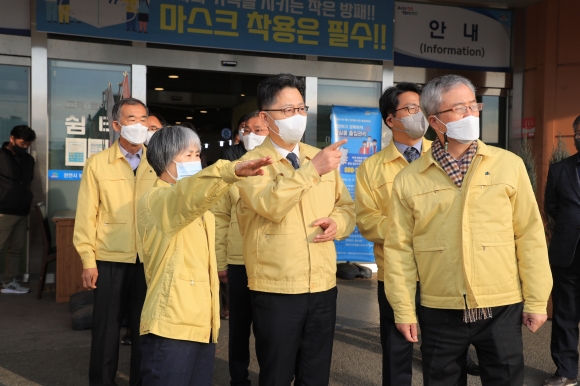 ↑↑ 김현수 장관이 지난해 12월 9일 천안 농수산물 도매시장의 코로나19 방역상황을 현장 점검했다./ 사진 =농축산부 제공