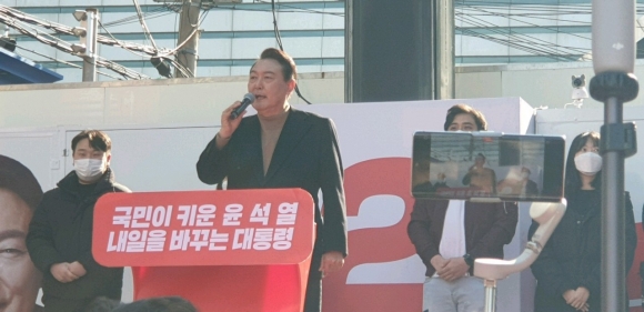 | ↑↑ 2월 18일 오후 윤석열 국민의힘 대선후보가 구미역 중앙로에서 유세를 이어갔다. [사진 제공 = 조종철 K문화타임즈 고문] |