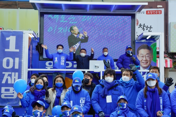 | ↑↑ 20대 대선 구미시 유세 현장 1번지 구미역 광장, 더불어민주당 김재우 구미시의회 의원의 사회로 진행한 ‘더불어민주당 구미시갑•을 선대위 합동 출정식’에서 마이크를 잡은 장세호 경북도당 선거대책위원장은 코로나19로 생존의 절벽 앞에 주저앉은 자영업자의 비극적인 현실을 화두로 던졌다. [사진 제공 =민주당 경북도당 선대위] |