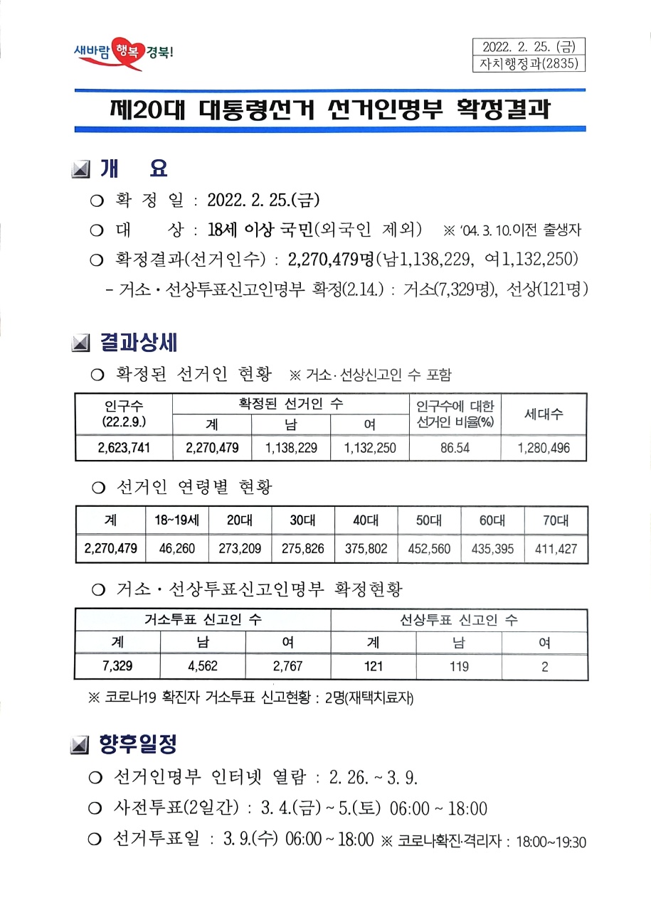 [K문화타임즈 =서일주 기자] 다음 달 9일 실시하는 제20대 대통령선거의 경북지역 선거인 수가 2월 25일 확정일 기준 227만 479명으로 최종 확정됐다고 27일 경북도가 밝혔다.