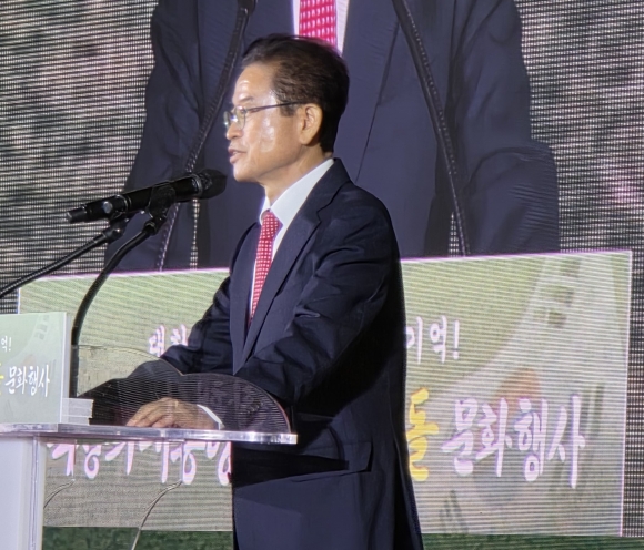 ↑↑ 박정희 대통령 탄신 108돌 문화행사에서 축사하는 이철우 경북지사. [사진 k문화타임즈] |