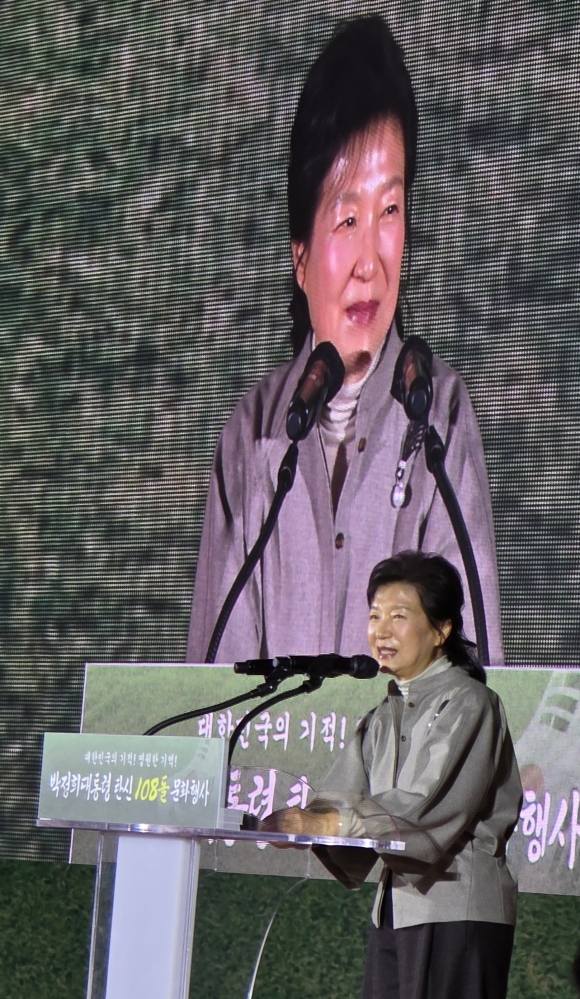 ↑↑ 박정희 대통령 탄신 108돌 문화행사에 유족대표로 참석해 인사말하는 박근혜 전 대통령. [사진 k문화타임즈] |