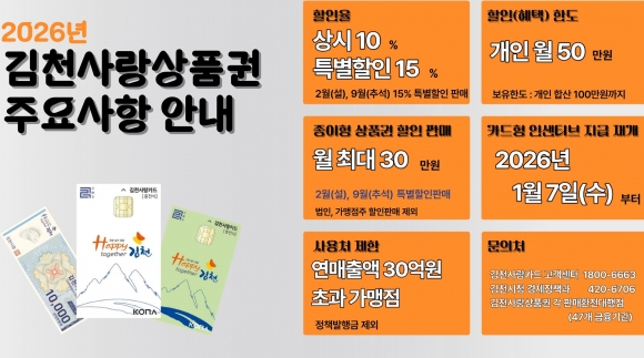 시는 7일부터 김천사랑상품권을 상시 10% 할인 판매해 민생경제 활성화와 소비 진작에 나선다. 올해 김천사랑상품권의 할인율은 작년 상반기보다 4~5%가 상향된 상시 10%(설, 명절 특별할인 15%)로 개인 1인당 월 50만 원까지 구매 시 5만 원, 특별할인 판매 시 7만 5천 원의 인센티브를 받을 수 있다.