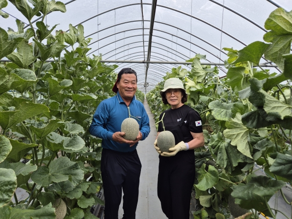 ↑↑ 왼쪽부터 장천면 멜론작목반 회장 정연덕, 김명순 내외 [사진 구미농업기술센터] |