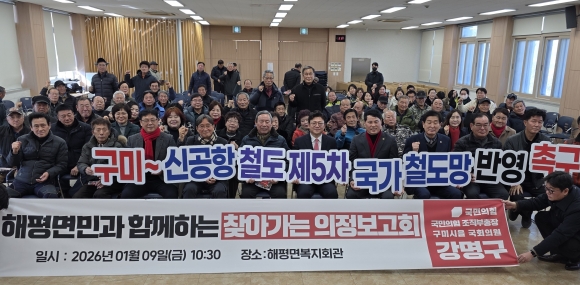 강 의원과 참석한 주민들은 일제히 “신공항 시대를 대비해 구미 강동지역에 ‘동구미역’ 신설이 반드시 필요하다. 대구·대구경북 통합신공항과 구미를 직접 연결하는 철도망이 구축되면 구미는 명실상부한 영남권 교통 중심지로 도약하게 될 것”이라며 유종의 미를 거둘 수 있도록 힘과 지혜를 모아나가자“고 결의했다.