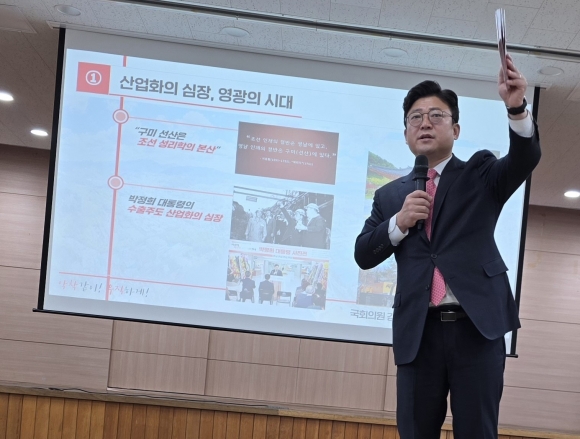 이날 의정보고회 현장에서는 ‘구미–신공항’ 철도의 제5차 국가철도망 구축계획 반영을 촉구하는 퍼포먼스도 함께 진행돼 관심을 끌었다.