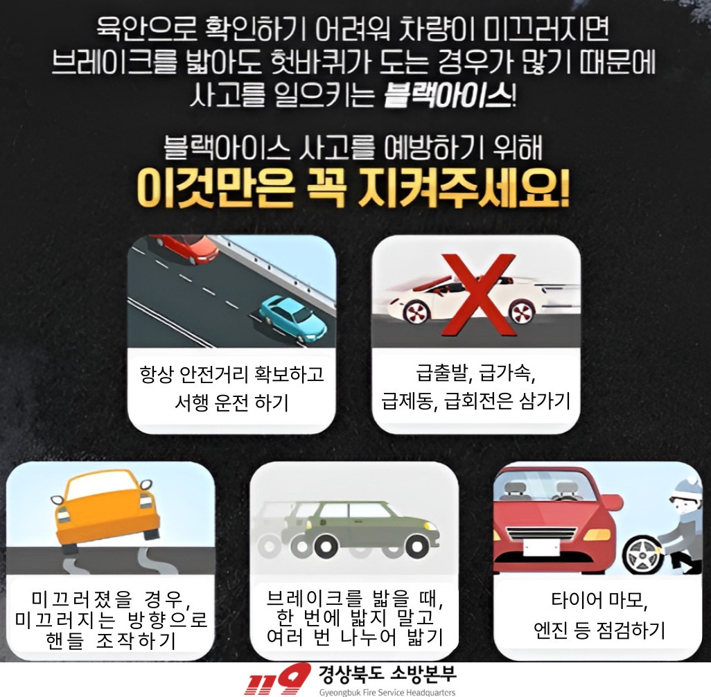 경북소방본부가 집계한 블랙아이스 교통사고 현황에 따르면, 2024년에는 11건의 사고로 심정지 1명, 경상자 8명, 2025년에는 14건의 사고로 중상자 1명, 경상자 16명 등 17명의 인명피해가 발생했다.