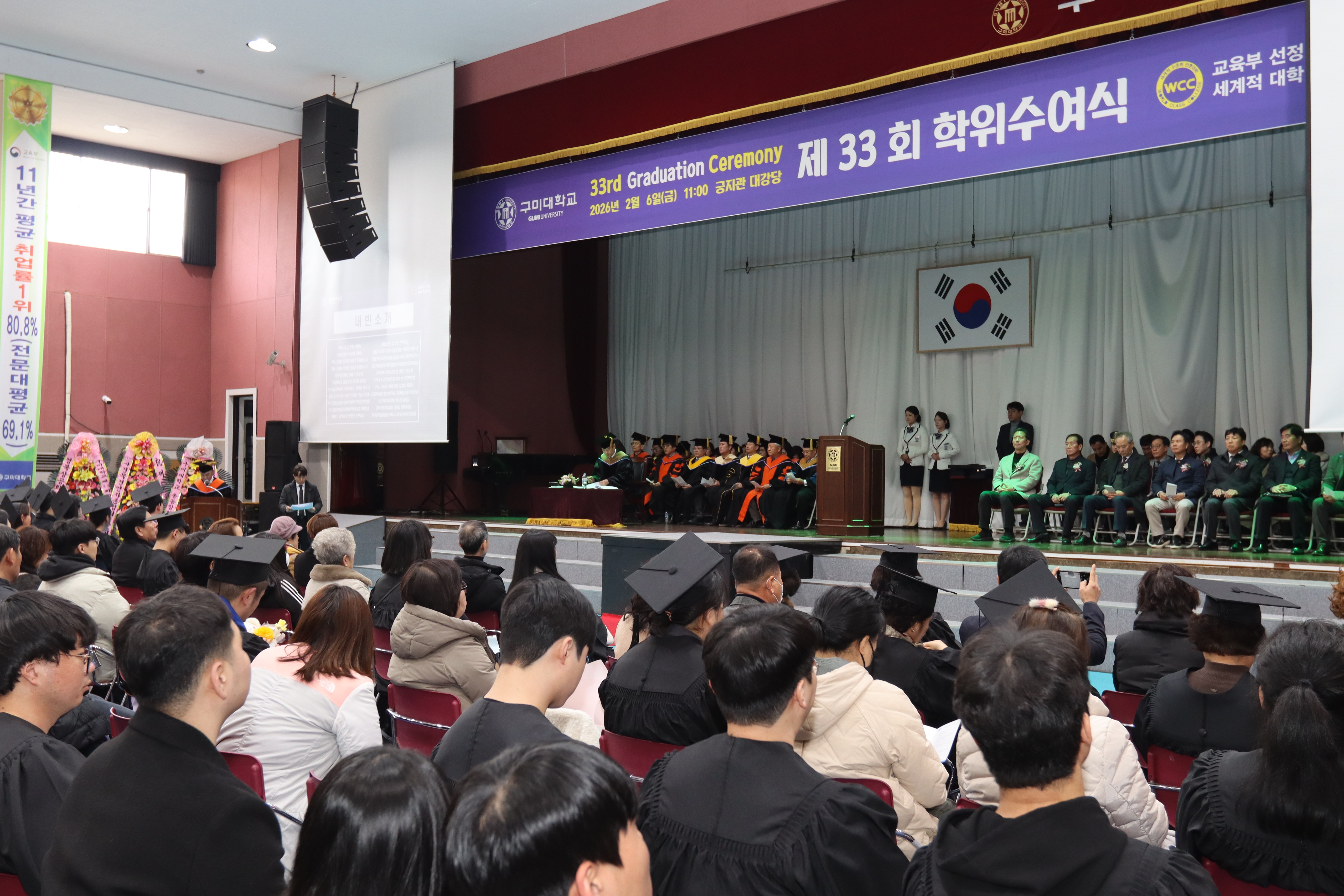 [K문화타임즈= 김미자 기자] 구미대학교가 지난 6일 교내 긍지관에서 ‘제33회 학위수여식’을 가졌다. 김장호 구미시장과 교수, 학생, 학부모 등 1,000여 명이 참석한 학위수여식에서는 전문학사 1,455명, 전공심화 학사 262명, 4년제 간호학사 265명 등 1,982명이 학위를 받았다.