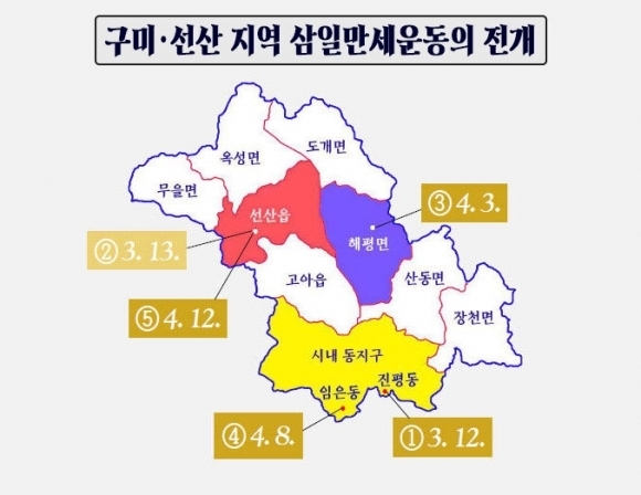 구미의 만세사건에서 첫 봉기를 촉발한 것은 학생층이었으나 3월 중·하순으로 가면서 차츰 군내의 면(面)으로 확대돼 나갔다. 선산장터 독립만세 운동을 통해 지방의 지식인과 장터 상인을 중심으로 항일 저항 운동이 저변으로 번져나간 것이다.