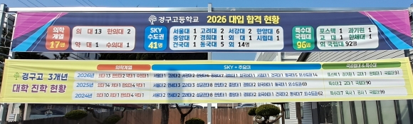 경구고는 지금, 학생들의 진로 선택 변화와 그 결과가 자연스럽게 맞물리는 지점에 서 있다. 최근 3년간의 입시 결과는 경구고가 단일 대학 성과가 아닌 의학계열 진로를 안정적으로 준비시키는 학교로 탄탄하게 자리를 잡았음을 입증한다.