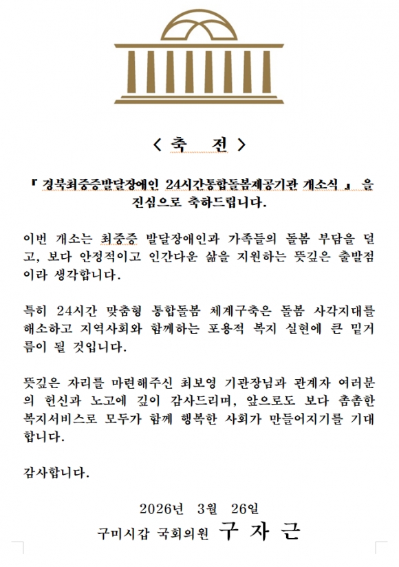 [k문화타임즈=김정원 기자] (사)경상북도장애인부모회 구미시지부가 운영하는 ‘경북최중증발달장애인 24시간통합돌봄제공기관(구미) 개소식이 지난 26일 구미시에서 열렸다.