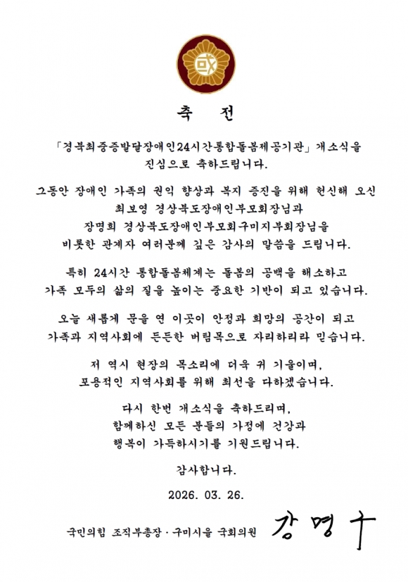 지난 2024년부터 포항과 경주에 각 1개소를 선정해 24시간 돌봄 사업을 제공해 온 경북도는 2025년 12월 구미시와 함께 구미에 제공기관을 추가 선정했다. 따라서 이번 개소를 통해 서비스 사각지대에 놓인 구미시 거주 발달장애인의 서비스 접근성이 한층 더 개선될 전망이다.