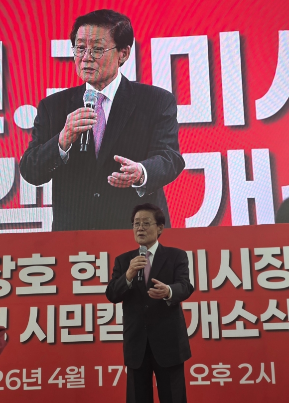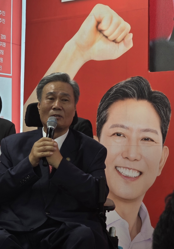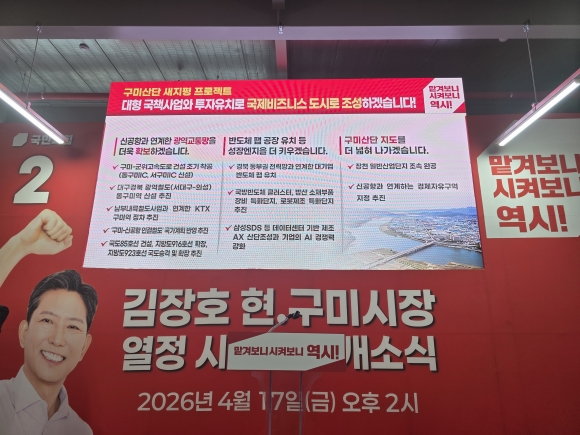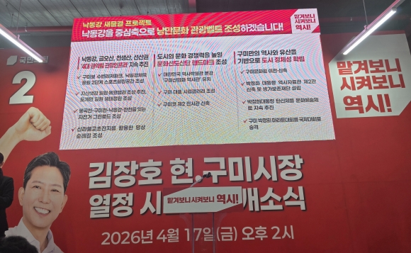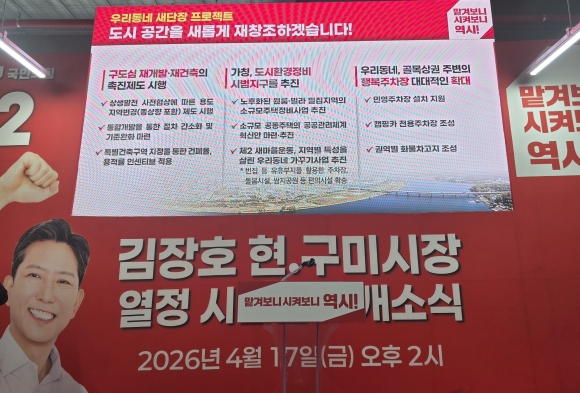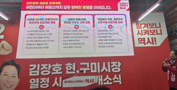 ↑↑ 공약과비젼을 소개하는 김장호 예비후보 [사진=K문화타임즈] |