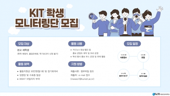 [k문화타임즈=김미자 기자] 국립금오공과학교가 국립대학육성사업 성과 확산과 홍보 강화를 위해 ‘2026학년도 KIT 학생 모니터링단’을 모집․운영 한다.